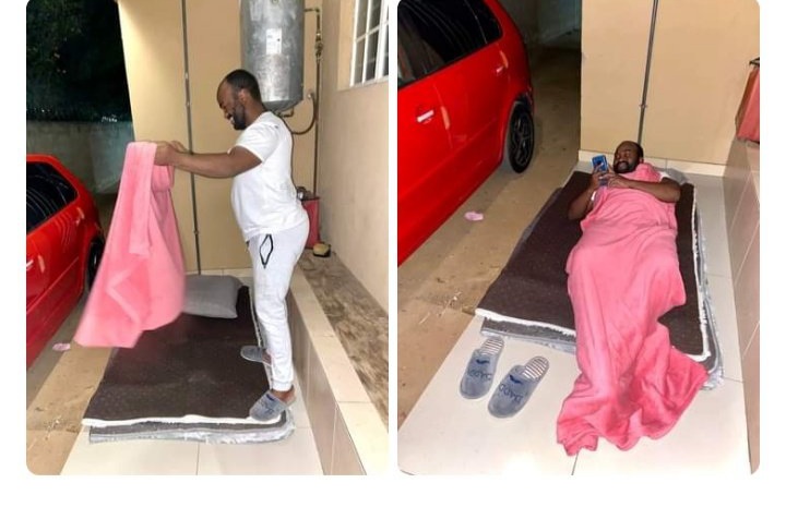 Umugabo yasangije amafoto ye aryamye ku musego hanze nyuma yo gusorwa mu nzu n’umugore we.