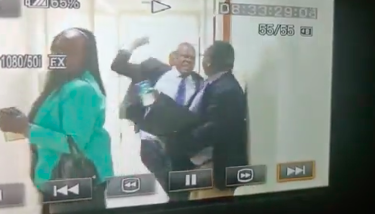 Amashusho yashyizwe hanze na Citizen Digital yerekana aba baburanyi bashwanira muri koridoro y’urukiko mbere yuko avoka atera igipfunsi uregwa.