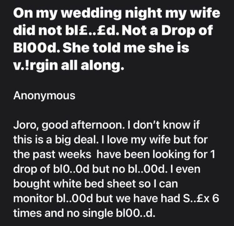Mu butumwa yanyujije ku mbuga nkoranyambaga bwari mu cyongereza ,ugenekereje mu kinyarwanda bufite umutwe w’ikibazo ugira uti:” Mu ijoro ry’ubukwe umugore wanjye ntiyavuye amaraso ,habe n’iraso na ricye ,kandi yambwiye ko ari isugi kuva cyera”