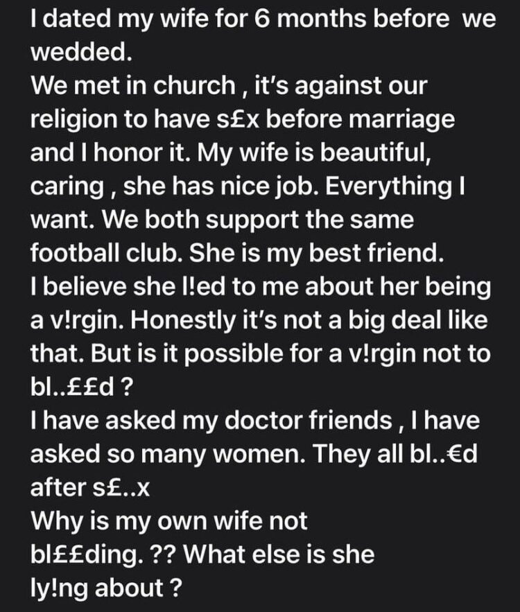 Umugabo yateye induru agisha inama ku mbuga nkoranyambaga nyuma yo gukora imibonano mpuzabitsina n’umugore yashatse yaramubwiye ko ari isugi ntave amaraso ,nyamara ngo barahuriye mu rusengero ,akaba ari kwibaza niba umugore we yaramubeshye.