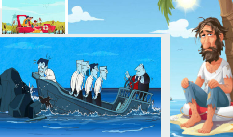 Bageze imbere gato ubwato bugira ikibazo ndetse butangira no kurohama, umusare arahindukira abaza umunyamashuri ati «ese wowe waba uzi gusimbukalogy, kogalogy, gucikalogy n’ibindi nk’ibyo?».