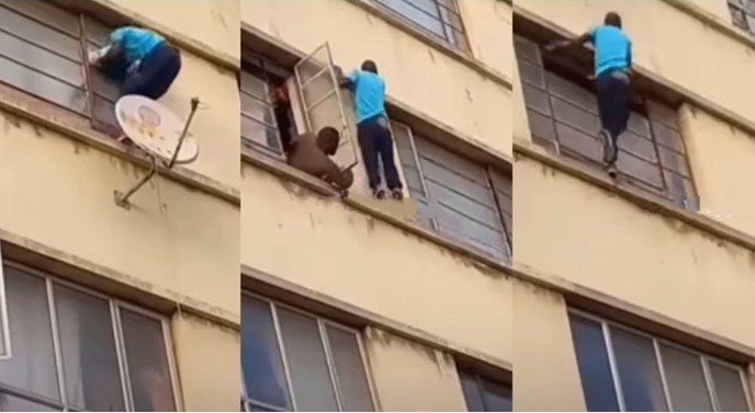 Mu mashusho yasakaye kuri instagram agaragaza uyu mugabo yuriye igorofa ashaka guhunga ,mugenzi we  amuri  n’icyuma.