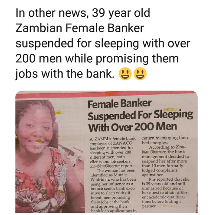 Ubuyobozi bwa Banki ya Zanaco muri Zambiya nyuma yo kuvumbura Mutale Winifridah wari umuyobizi mukuru muri Banki, bwahagaritse uyu mugore. Amakuru ya Kenydaily news nk’uko icyo gihe yabitangaje, inkomoko yo kuvumbura ko Mutale Winifridah asambanya abagabo bose bahawe akazi n’abagashaka , imbarutso ni abagabo bagera ku 10 bishyize hamwe barabyamagana kuko bijejwe akazi ntibakabona kandi barabanje kuryamana n’ugatanga Mutale Winifridah.Uyu mugore akaba yarahise yirukanwa ku kazi ke.