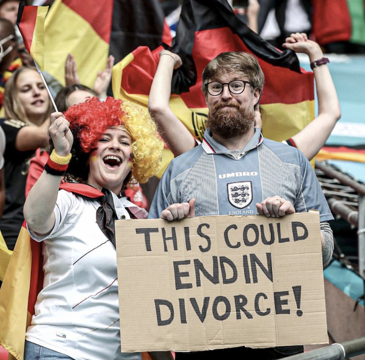 Nyuma y’intsinzi y’Ubwongereza ku bitego 2 ku busa bw’Ubudage, Umugabo yahise yerekana ikirango cyanditseho ngo « THIS COULD END IN DIVORCE! » bishatse kuvuga ngo « IBI BISHOBORA KURANGIRIRA MURI GATANYA ». Ni nyuma yuko umugore we yararimo kumwishima hejuru nyuma yuko ikipe afana yari imaze gutsindwa ndetse inatashye.