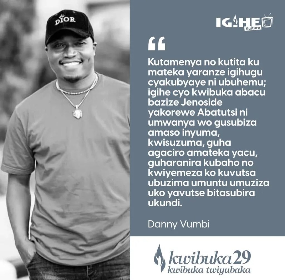 Danny Vumbi yagize ati:” Kutamenya no kutita ku mateka yaranze igihugu cyakubyaye ni ubuhemu. Igihe cyo kwibuka abacu bazize Jenoside yakorewe Abatutsi ni umwanya wo gusubiza amaso inyuma, kwisuzuma, guha agaciro amateka yacu, guharanira kubaho no kwiyemeza ko kuvutsa ubuzima umuntu umuziza uko yavutse bitazasubira ukundi”.