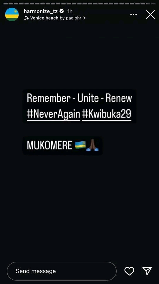 Harmonize abinyujije ku rukuta rwe rwa Instgram yashyizeho ubutumwa bumara amasha 24 (Instgram Story) , ubutumwa bw’ihumure ku banyarwanda abifuriza gukomera muri ibi bihe bitoroshye byo kuzirikana inzirakarengane zazize Jenoside yakorewe Abatutsi.