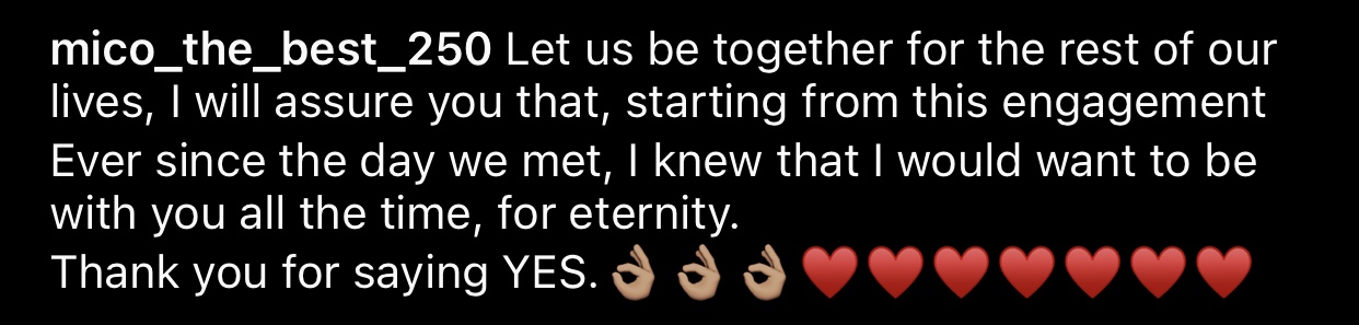 Ni mu muhango wabaye ku munsi w’ejo tariki ya 04 Nyakanga 2021. Nyuma y’uyu muhango, Mico The Best abinyujije ku rukuta rwe rwa instagram yashyize hanze amafoto y’uko byari bimeze maze ayaherekesha amagambo agira ati «  Let us be together fot the rest of our lives, I will assure you that, starting from this engagement Ever since the day we met, I knew that I would want to be with you all the time, for the eternity. Thank you for saying YES. 👌🏼👌🏼👌🏼❤️❤️❤️❤️❤️❤️❤️ ».