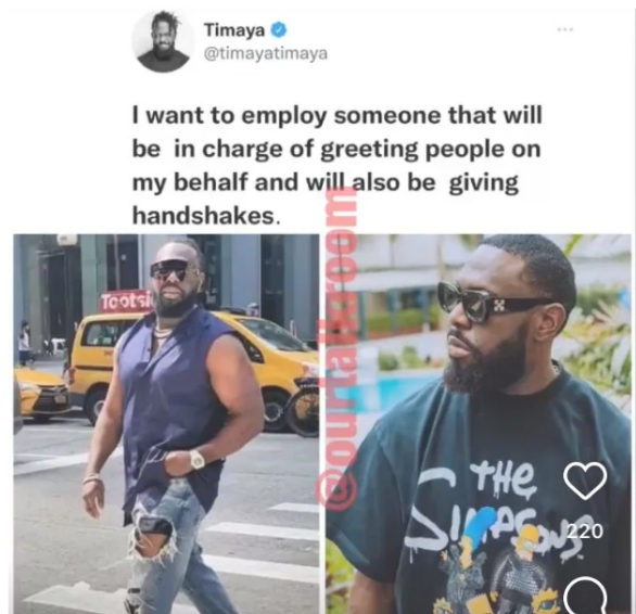 Umuririmbyi ukomeye muri Afurika Timaya, yatangajeko arambiwe no kugenda asuhuzanya n’abantu, ahubwo atanga akazi k’umuntu uzajya ugenda umusuhiriza abantu mu cyimbo cye.