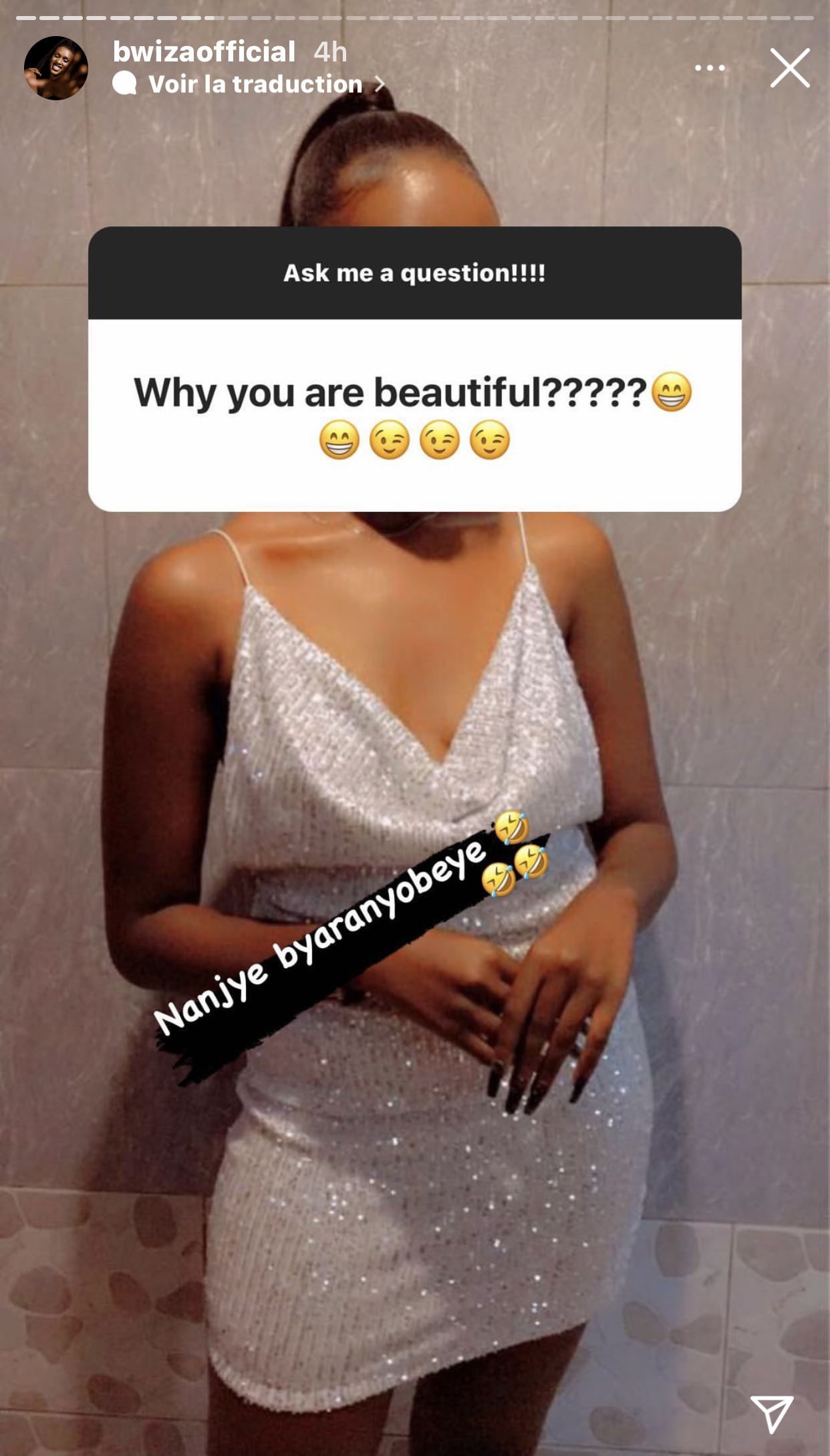 Nyuma yuko Bwiza asabye abafana be kumubaza ibibazo byose bashaka. Umwe mu bafana ba Bwiza yamubajije agira ati « Why are you beautiful ?????😁😁😉😉😉 ».. Ugenekereje mu Kinyarwanda bishatse kuvuga ngo « Kuberiki uri mwiza ?????😁😁😉😉 ». Bwizq yahise amusubiza mu magambo agira ati « Nanjye byaranyobeye 🤣🤣🤣 ».