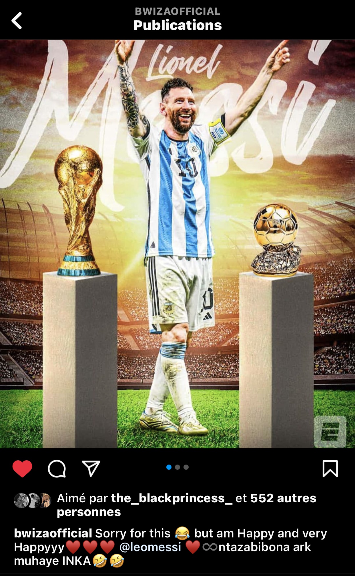 Abinyujije ku rukuta rwe rwa instagram, Bwiza yashyize hanze ifoto ya Lionel Messi maze ayiherekesha amagambo agira ati « Sorry for this 😂 but am Happy and very Happyyy♥️♥️♥️ @leomessi ♥️♾️ntazabibona ark muhaye INKA🤣🤣 ».