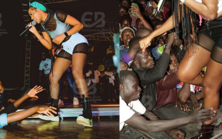 Umuhanzikazi yagiye ku rubyiniro ubundi aramansura maze irari rifata abafana batangira gushaka kumufata ku myanya y’ibanga aho yahise akora igikorwa cyateye benshi kugendera kure imyanya ye y’ibanga