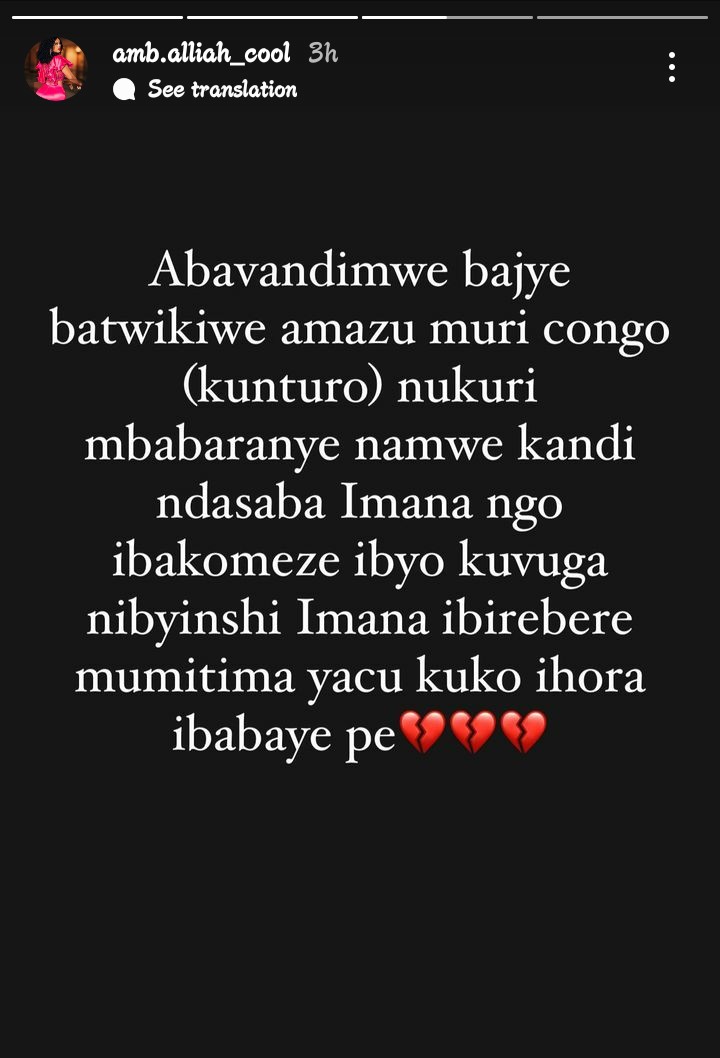 Alliah Cool yagize ati “Abavandimwe bange batwikiwe amazu muri Congo (kunturo) nukuri mbabaranye namwe kandi ndasaba Imana ngo ibakomeze ibyo kuvuga ni byinshi Imana ibirebere mu mitima yacu kuko ihora ibabaye pe 💔💔💔”.
