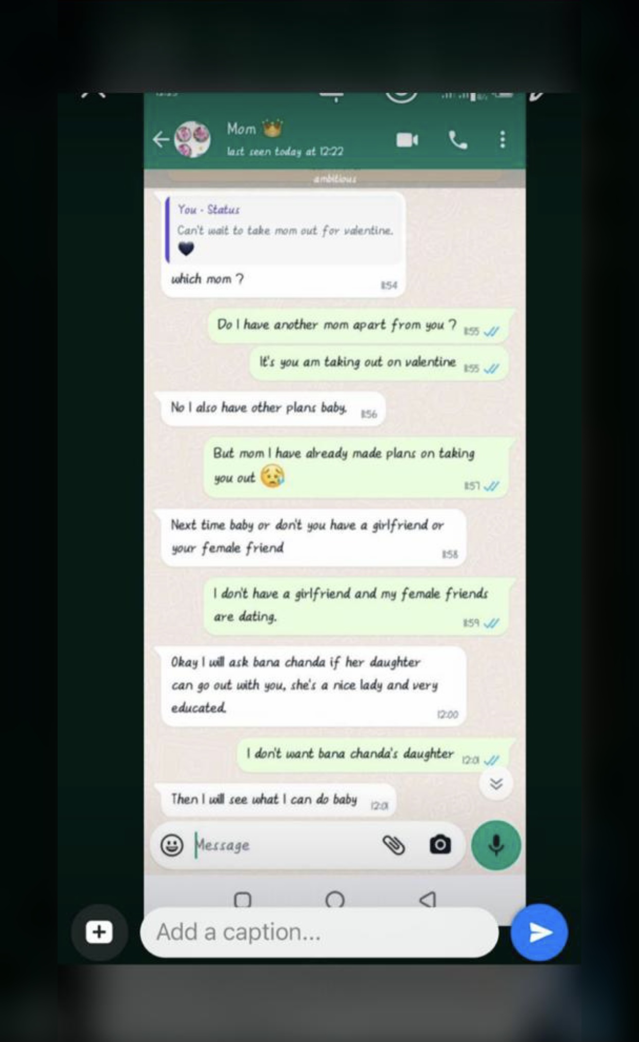 Nkuko bigaragara mu butumwa bwagiye hanze, umuhungu yatangiye ashyira kuri status ubutumwa buvuga ko ashaka kuzasohokana na Nyina kuri Saint Valentin. Nyina ngo abikubite amaso abisamira hejuru niko kumusimbukana amubwira ko adahari ko nawe azaba afite izindi gahunda ze yibereyemo. Nyina yahise abaza umuhungu niba nta mukunzi cyangwa se umukobwa w’inshuti ye afite nuko umuhungu amubwira ko abakobwa b’inshuti ze bose bafite abakunzi.