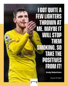 Andy Robertson ubwo yaterwaga ibibiriti na bafana ya batangarije ko bashobora kuza kubura ibyo bacanisha mugihe baba bashatse kunwa itabi.