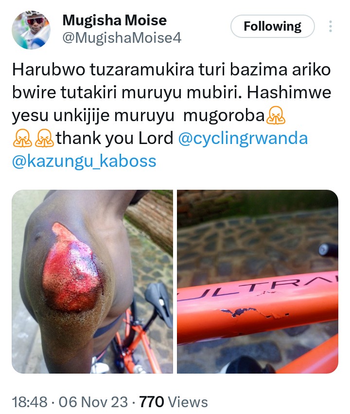 Umukinnyi wabigize umwuga mu gusiganwa ku magare, Mugisha Moïse, yakoze impanuka ikomeye akomereka urutugu ubwo yari mu myitozo ku gicamunsi cyo kuri uyu wa Mbere, tariki ya 6 Ugushyingo 2023.