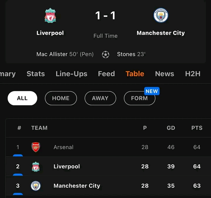 Umukino wahuzaga Manchester City yanganyije na Liverpool igitego 1-1, byabereye amahirwe Arsenal kuko yahise ifata umwanya wa Mbere.