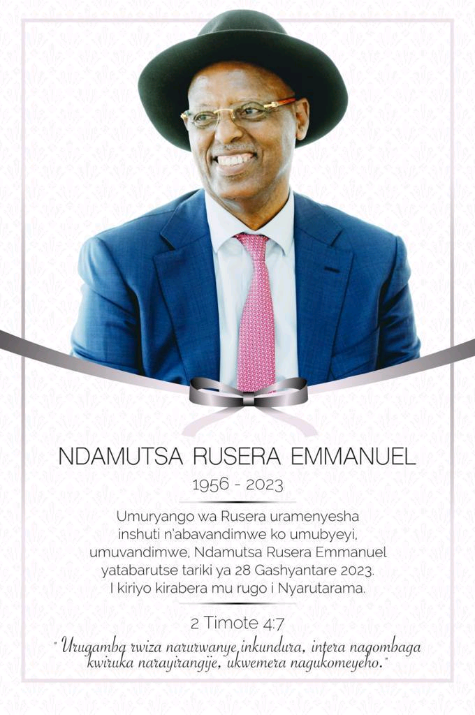 Itangazo ryashyizwe hanze n’umuryango we, rivuga ko “Ndamutsa Rusera Emmanuel yatabarutse tariki 28 Gashyantare 2023, ndetse ko ikiriyo kiri kubera mu rugo rwe i Nyarutarama.”