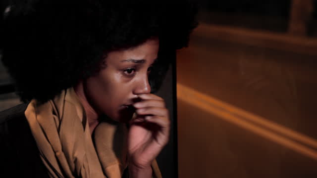 Sad african-american young woman with afro hair sitting on public bus crying wiping tears