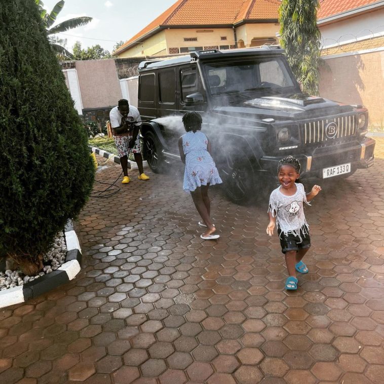 Mu mashusho Bruce Melodie yashyize kuri Instagram agaragaza ateruye umwana we muto maze umukuru afite umupira ari kuhira imodoka maze akajya anyuzamo akanuhira se na murumuna we.