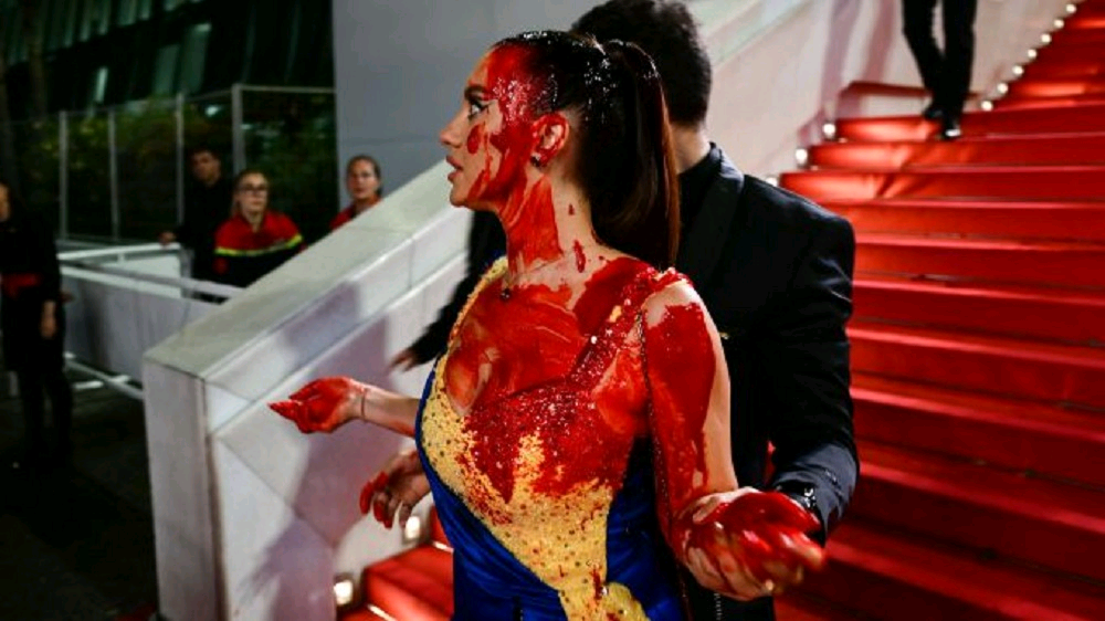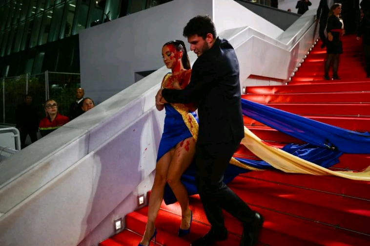 Nk’uko bigaragara mu mashusho Ilona Chernobai yinjiye muri ibi birori bya Festival de Cannes nk’umunyamideli usanzwe ariko yari yitwaje ishashi irimo amatembabuzi asa n’amaraso.