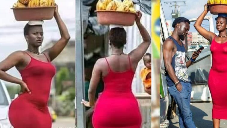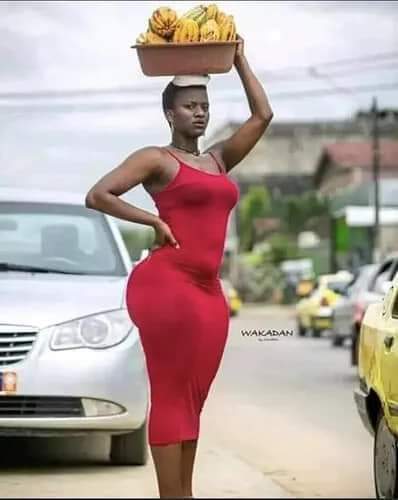 Umukobwa wambaye akaganzu gatukura, kamwegereye kagaragaza imiterere y’ikibuno cye, yatunguye benshi ubwo yagaragaraga mu muhanda agenda ashaka abamugurira ibyo yari yavanye mu rugo abitwaye ku mutwe.