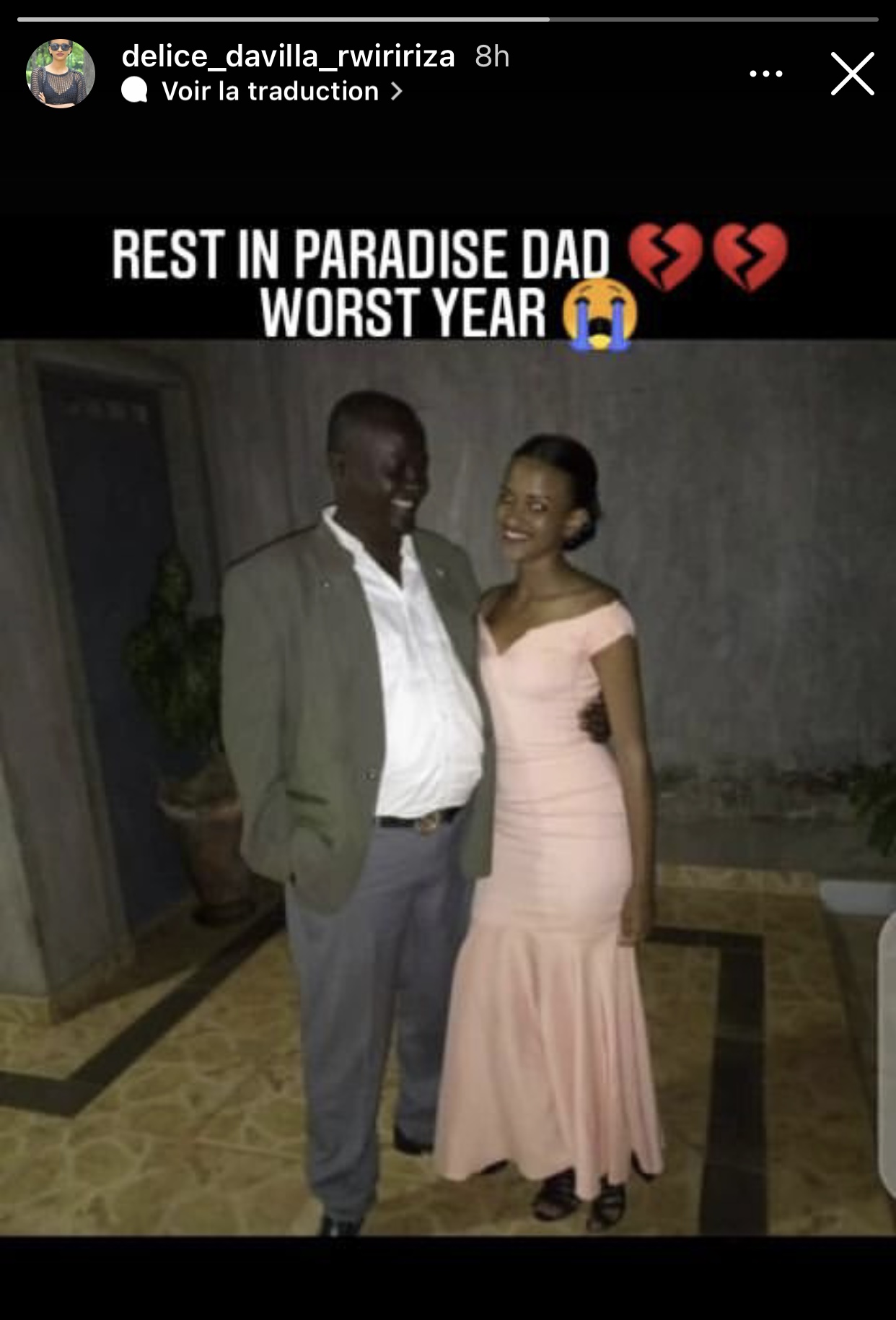 Delice abinyujije kuri stoey ya instagram ye yashyize hanze ifoto ari kumwe na Papa we maze ayiherekesha amagambo agira ati « Rest in Paradise Dad 💔💔 worst year 😭 ».