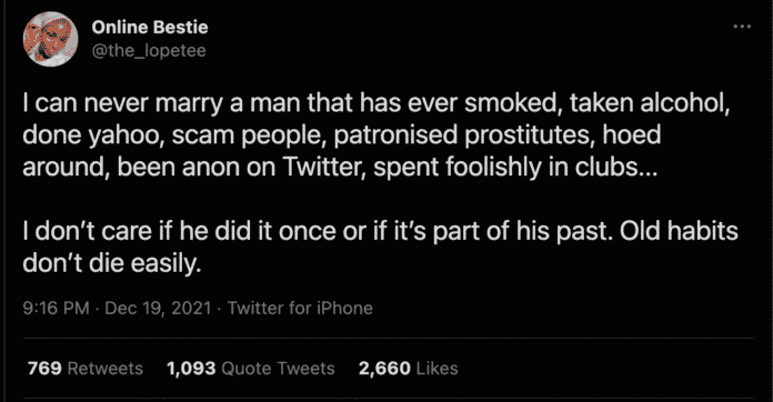 ” Ntabwo nshobora kurongorwa n’umugabo wigeze anywa itabi, anywa inzoga, akoresha yahoo, abashuka abantu, ukorana n’indaya, uzunguruka hirya no hino, uba kuri Twitter, amara ubupfapfa muri clubs… Sinzi niba yarabikoze rimwe cyangwa niba ari ibyahise. Ingeso za cyera ntabwo umuntu apfa kuzireka.”