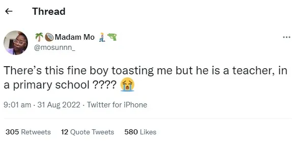 Uyu mukobwa wo muri Nigeriya uzwi ku izina rya Mosun asa nkaho adafata icyemezo cyo kwemera gukundana numukunzi wamusabye urukundo yavuze ko yababajwe no kumenya ko uyu musore ari umwarimu.Yabitangaje abinyujije ku rubuga rwe rwa Twitter ko umusore amureshya ari mwiza, ariko ikibazo cye kiri mu kuba ari umwarimu.