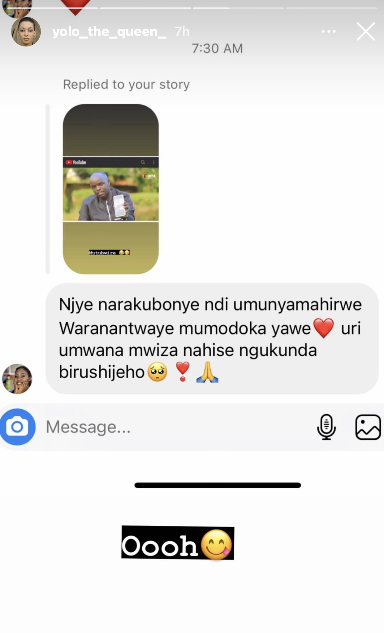 Umufana Yolo The Queen yatwaye mu modoka ye yahise asubiza mu magambo agira ati « Njye narakubinye ndi umunyamahirwe waranantwaye mu modoka yawe❤️ Uri umwana mwiza nahise ngukunda birushijeho 🥹❣️🙏🏽 ».