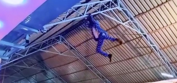 Uyu mugabo yakomeje kubyina ari nako yabonye ko kubyinira hejuru ya bafure bidahagije yahise yinaganika ku gisenge hejuru.