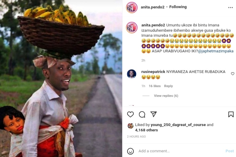 Umunyamakuru ukaba n’umushyushyabirori Anita Pendo yagaragaje ko yababajwe n’umuntu wafashe ifoto y’umugabo ucuruza imineke ahetse umwana maze ahinduramo Anita ahetswe na Mazimpaka Japhet bakorana.