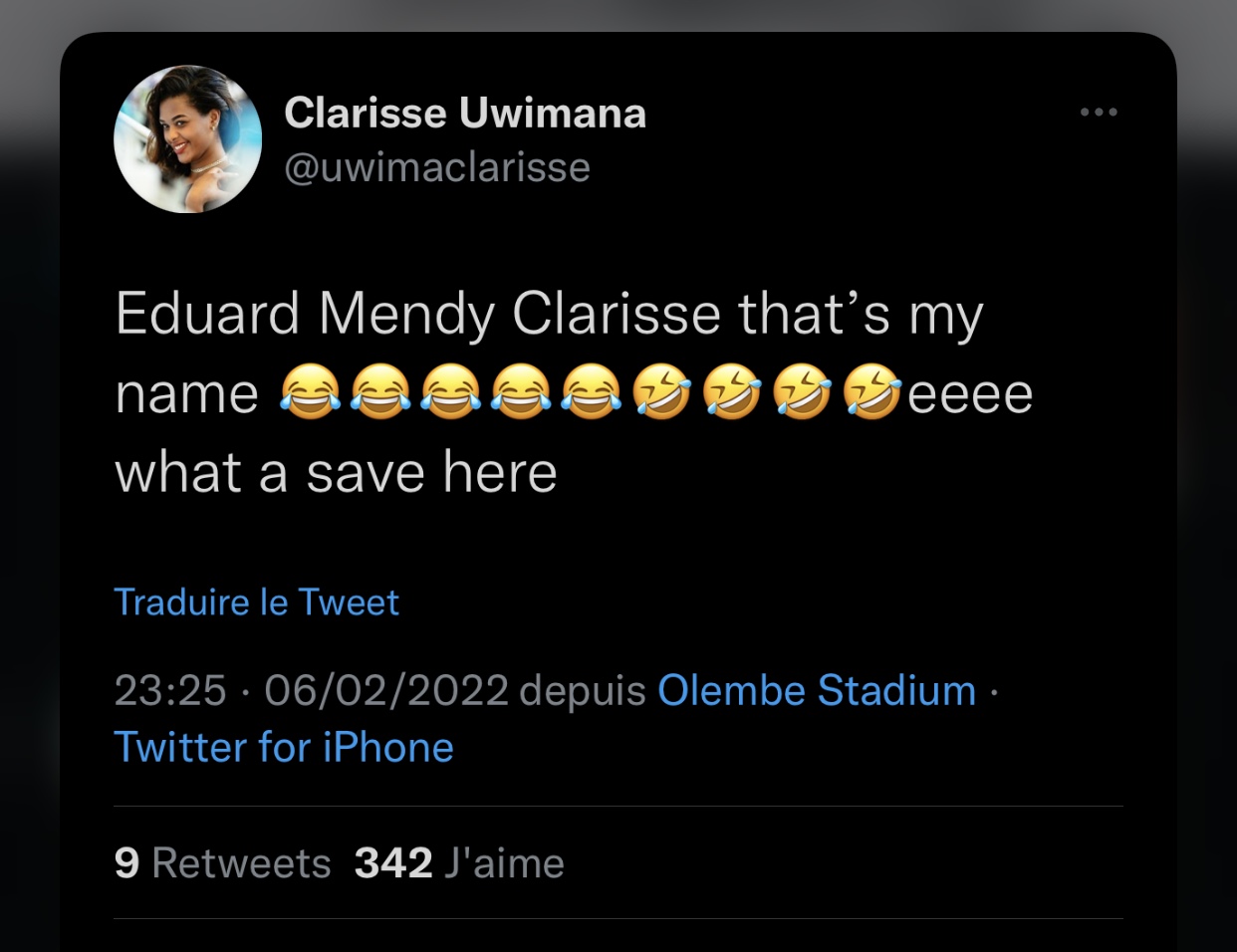 Clarisse Uwimana abinyujije ku rukuta rwe rwa Twitter yanditse amagambo agira ati « Eduard Mendy Clarisse that’s my name 😂😂😂😂😂🤣🤣🤣🤣eeee what a save here ». Ugenekereje nu Kinyarwanda bishatse kuvuga ngo « Eduard Mendy Clarisse niryo zina ryanjye…. ».