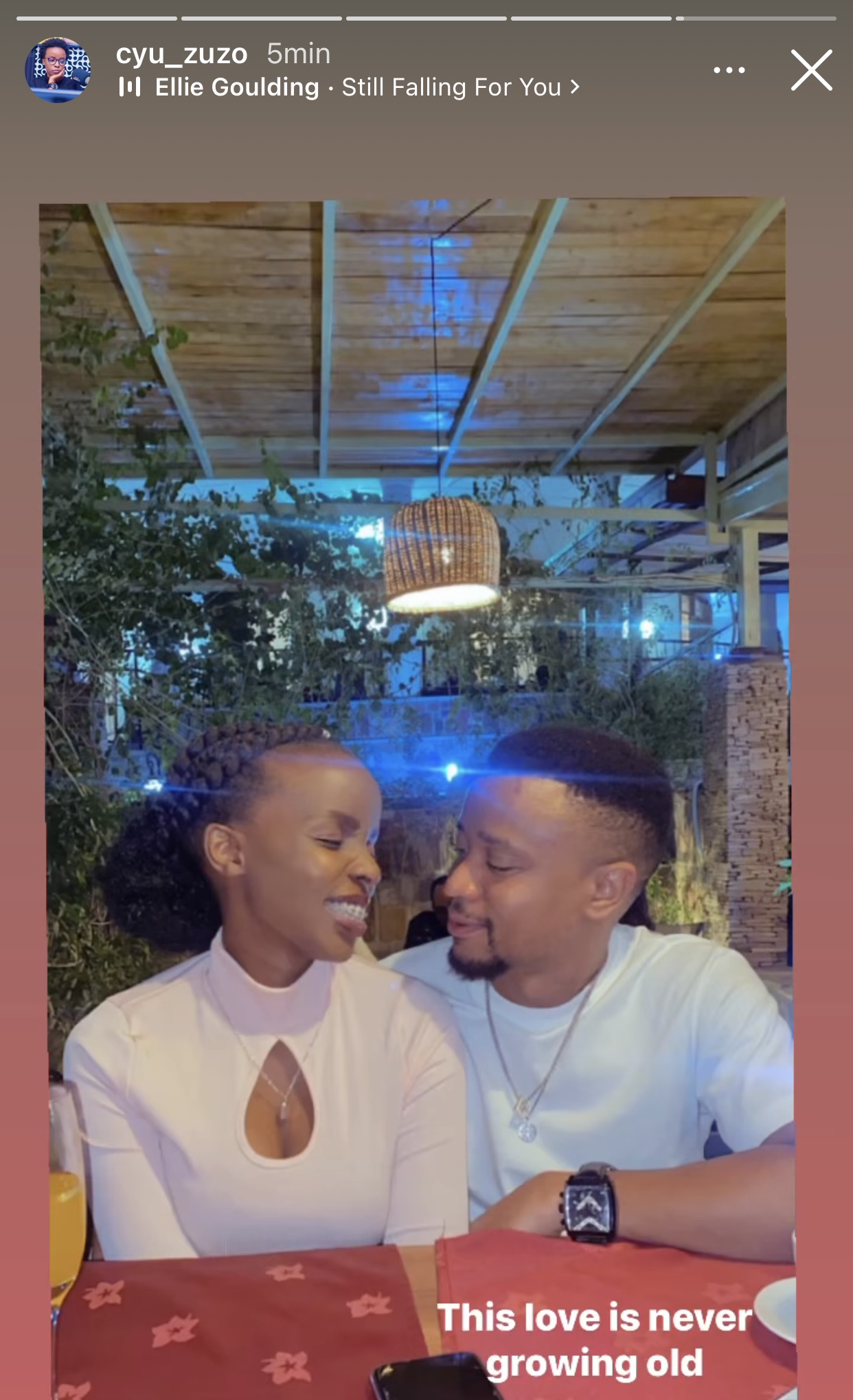 Ni ifoto Cyuzuzo yashyize hanze abinyujije kuri story ya instagram ye maze ayiherekesha amagambo y’urukundo akubiye ku ndirimbo yitwa Still falling for you ya Ellie Goulding. Iyo foto ni iyi ikurikira: