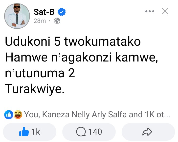 Umuhanzi w’Umurundi Sat B abinyujije ku rukuta rwe rwa Facebook yatangaje amagambo arimo urujijo rwinshi ariko afindura ko hari uwo ashaka kuzakubita umuntu udukoni 5 two ku matako.