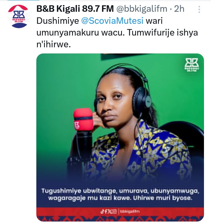 Mu butumwa B&B Kigali FM yanyujije ku mbuga nkoranyambaga zayo, yagize iti “Tugushumiye ubwitange, umurava, ubunyamwuga, wagaragaje mu kazi kawe. Amahirwe muri byose.”