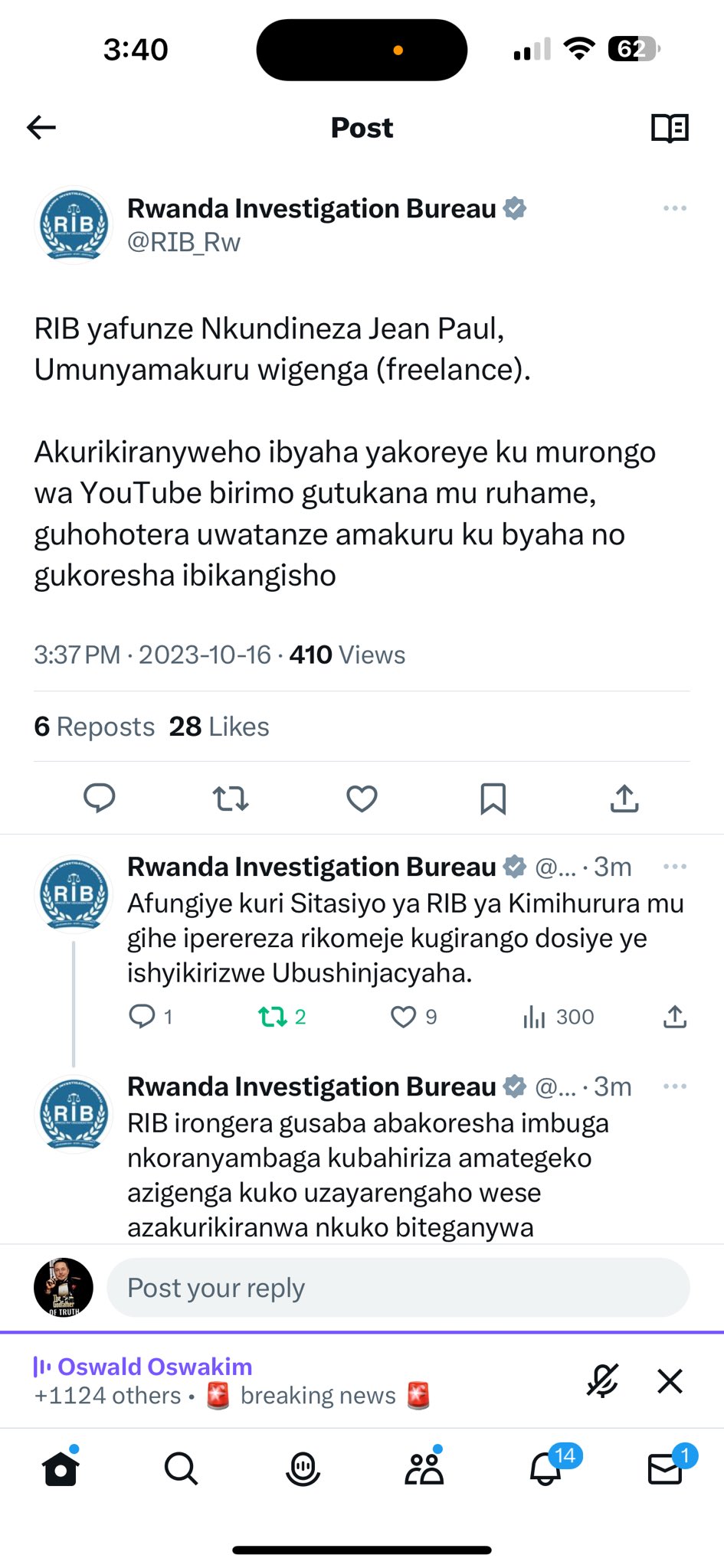 Urwego rw’Igihugu rw’ubugenzacyaha, RIB rwafunze Nkundineza Jean Paul, usanzwe ari umunyamakuru wigenga.