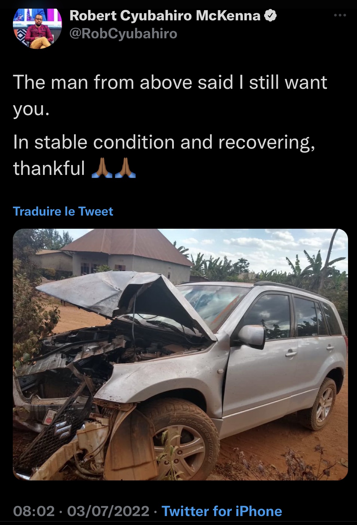 Abinyujije ku rukuta rwe rwa Twitter yashyize hanze ifoto igaragaza imodoka ye yangiritse cyane maze ayiherekesha amagambo agira ati « The man from above said I still want you. In stable condition and recovering, thankful 🙏🏾🙏🏾 ».