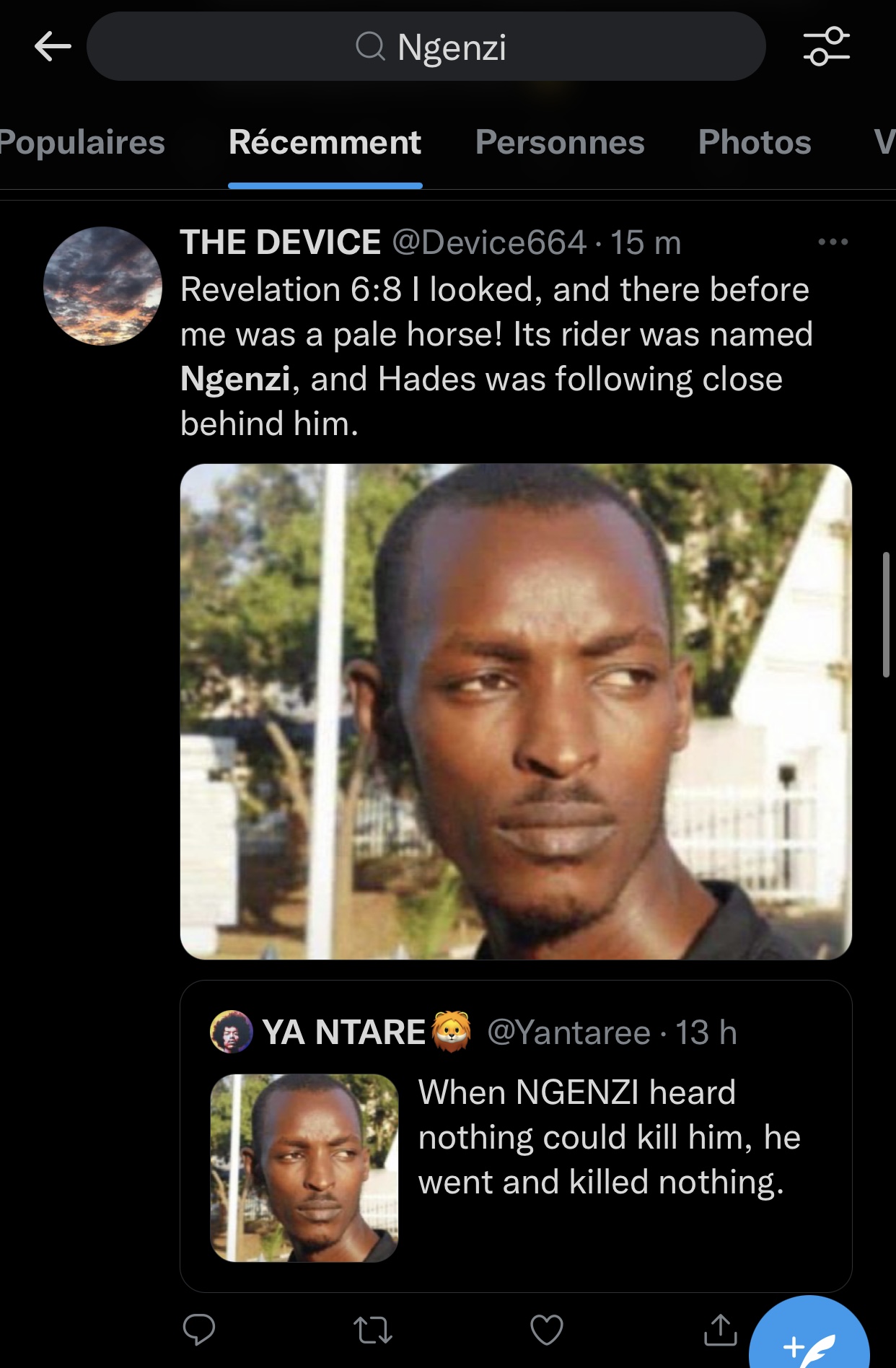 Umunyamakuru Umuhire Rebecca ukorera Radio Royal Fm yabajije abakoresha Twitter icyo barimo guhora Ngenzi maze umwe mu bakoresha Twitter amusubiza mu magambo agira ati « Yakomye mu mashyi n’ukuboko kumwe ».