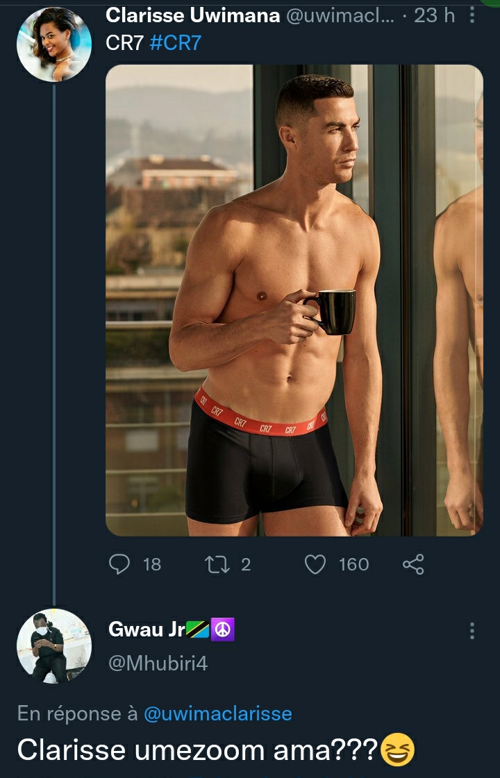 Umunyarwandakazi Clarisse Uwimana wamamaye kuri Radio B&B Fm Umwezi aho akora itangazamakuru, yasangije abamukurikira ifoto ya Cristiano Ronaldo igaragaza ubugabo bwe. Ni ifoto Clarisse yashyize hanze abinyujije ku rukuta rwe rwa Twitter.