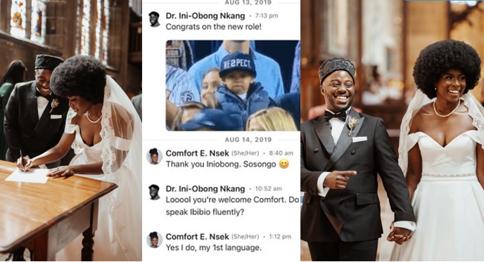 Yamushimiye mu rurimi rwe kavukire, Ibibio na Ini-Obong, maze urukundo rwabo rutangira ubwo.Iyi couple yakomeje gukundana kugeza ubwo kuri uyu wa Gatandatu biyimeje kubana nk’umugabo n’umugore.