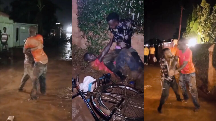 Umunyonzi witwa Bosco atimbaguranye na mugenzi we mu mvura umwe akajya aterura undi agakubitwa hasi bari gupfa utuntu tw’amafuti