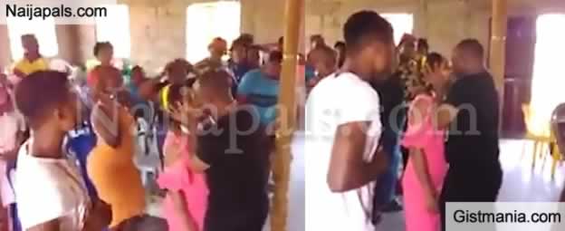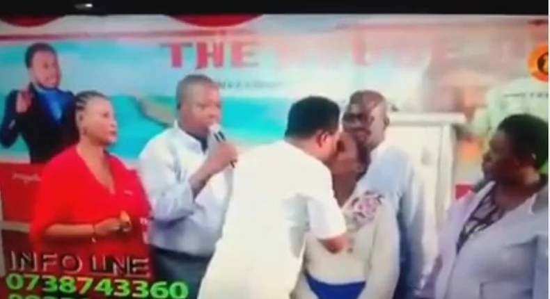 Muri videwo irimo kuzenguruka ku mbuga nkoranyambaga, abagore babiri n’abandi bagabo babiri bagaragara bahagaze iruhande rwa pasiteri ubwo yasomanaga n”uyu mugore wari waje mu rusengero.