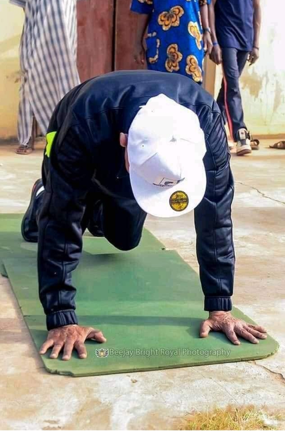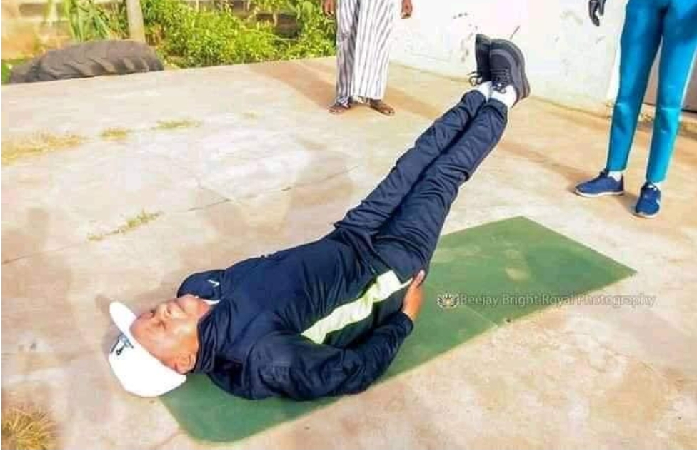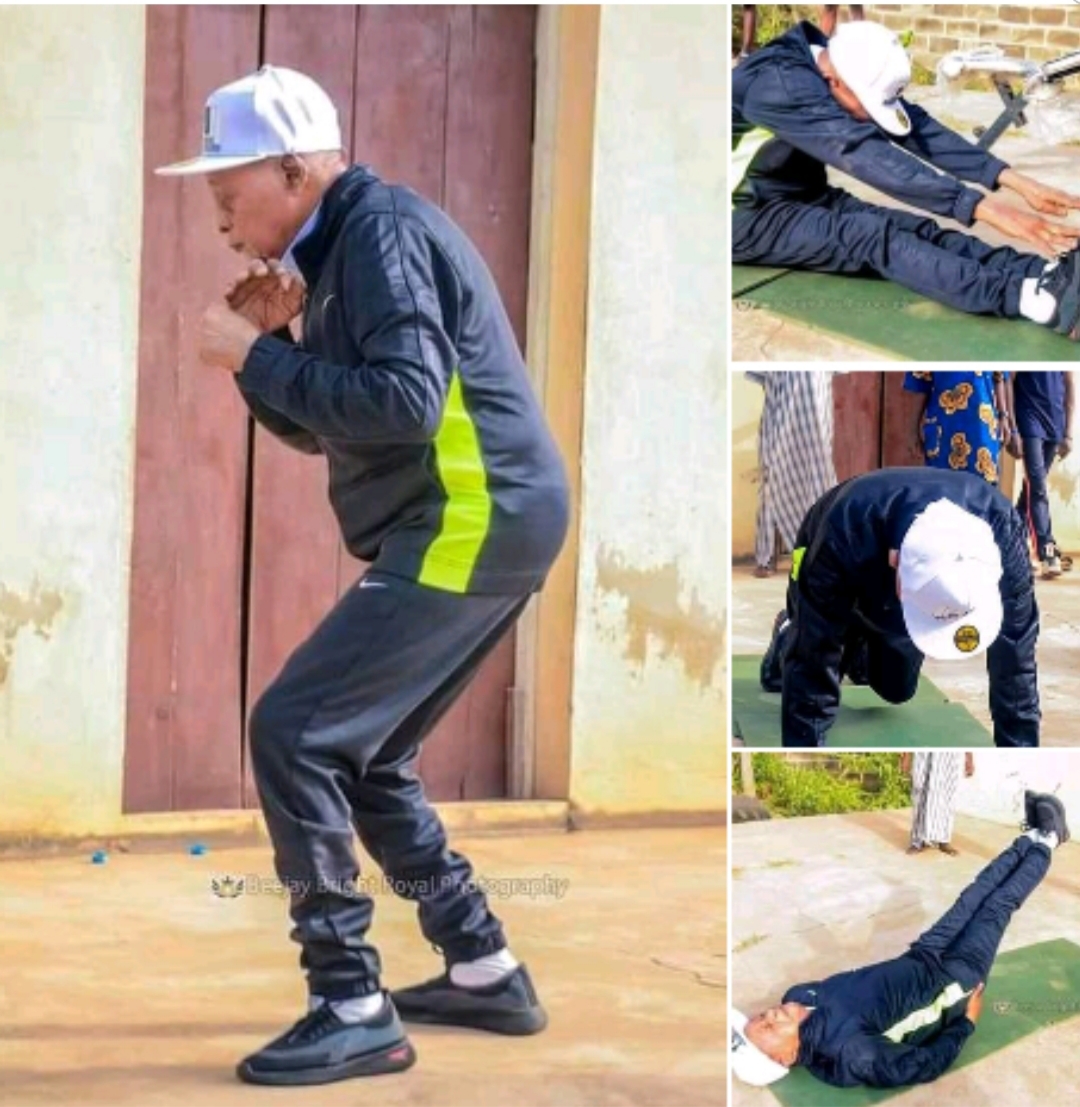 Amafoto ari gucicikana kumbuga nkoranyambaga nka Facebook, agaragaza uyu musaza ari gukora imwe mu myitozo y’abasore nko kunanura umugongo ndetse no gukora push ups, yambaye imyenda ya sport y’umweru n’umukara.