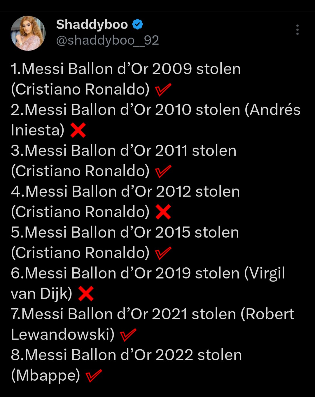 Abinyujije ku rukuta rwe rwa X yahoze yitwa Twitter, Shaddy Boo yameje ko Lionel Messi yibye Ballon d’Or ya 2023.