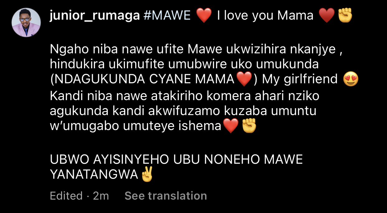 Rumaga yahishuye urwo akunda umubyeyi wa mwibarutse maze ajya ku mbuga nkoranyambaga ze yandika amagambo y’urukundo.