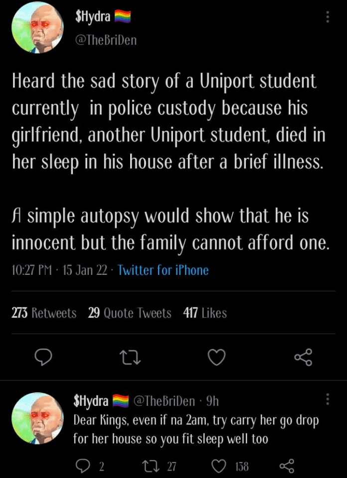 Bivugwa ko uyu musore yabonye ubuzima bwumukunzi we buri mu marembera ,abura icyo yakora ndetse ananirwa no gutabaza birangira uyu mukunzi we aguye iwe .Uwitwa Hydra watanze aya makuru kuri Twitter yakebuye abasore bemerera abakobwa kuza kurara iwabo ,kuko bashobora kwishyira mu kaga batabizi.Uyu musore bivugwa ko umuryango wumukobwa watangiye kumushinja kubicira umukobwa ndetse yamaze gutabwa muri yombi kugirango asobanure iby’urupfu rw”uwari umukunzi we.
