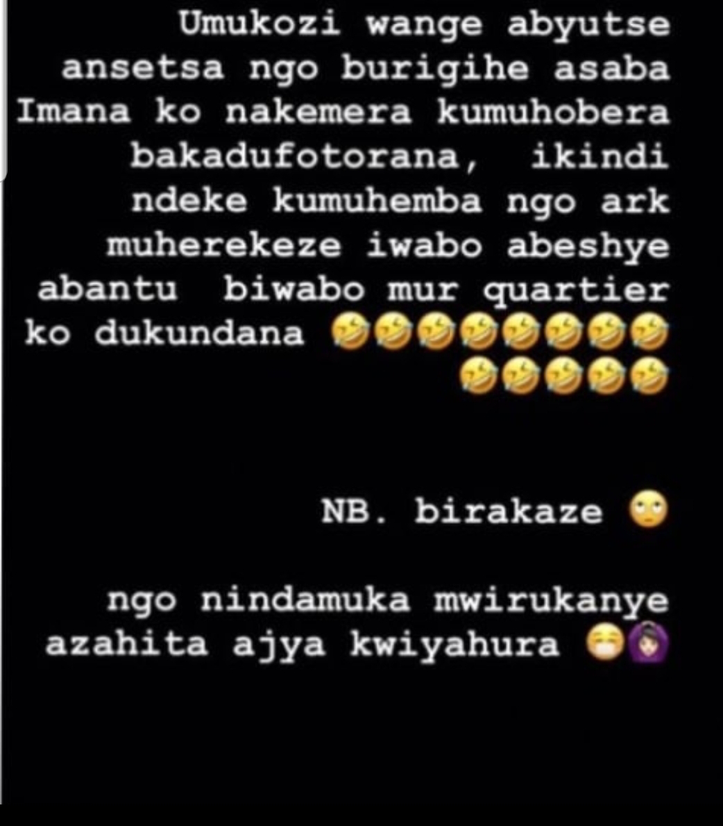 Ati “Umukozi wanjye abyutse ansetsa ngo buri gihe asaba Imana ko nakemera kumuhobera bakadufotorana. Ikindi ndeke kumuhemba ngo ariko muherekeze iwabo abeshye abantu b’iwabo ko dukundana ”