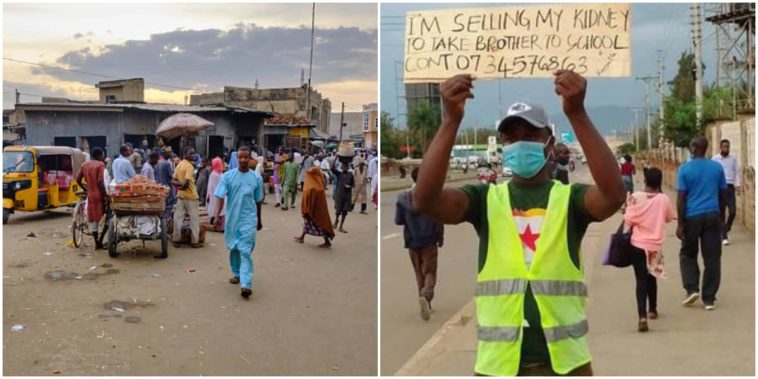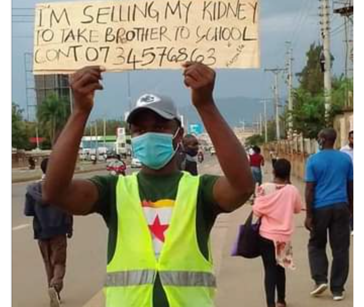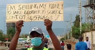 Umusore witwa Felex Joel w’imyaka 26 y’amavuko yateye abantu ikiniga ubwo yagaragaraga mu muhanda afite icyapa cyanditseho ko arimo kugurisha impyiko ye kugirango abone amafaranga y’ishuri ya murumuna we.