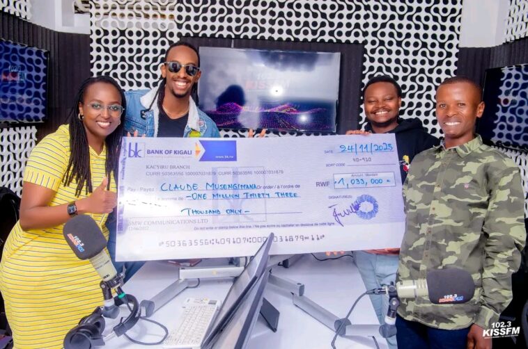 Uyu munsi tariki 24 Ugushyingo 2023, Claude MUSENGIMANA watsindiye 1,033,000 RWF kuri Kiss Fm yashyikirijwe Cheque.