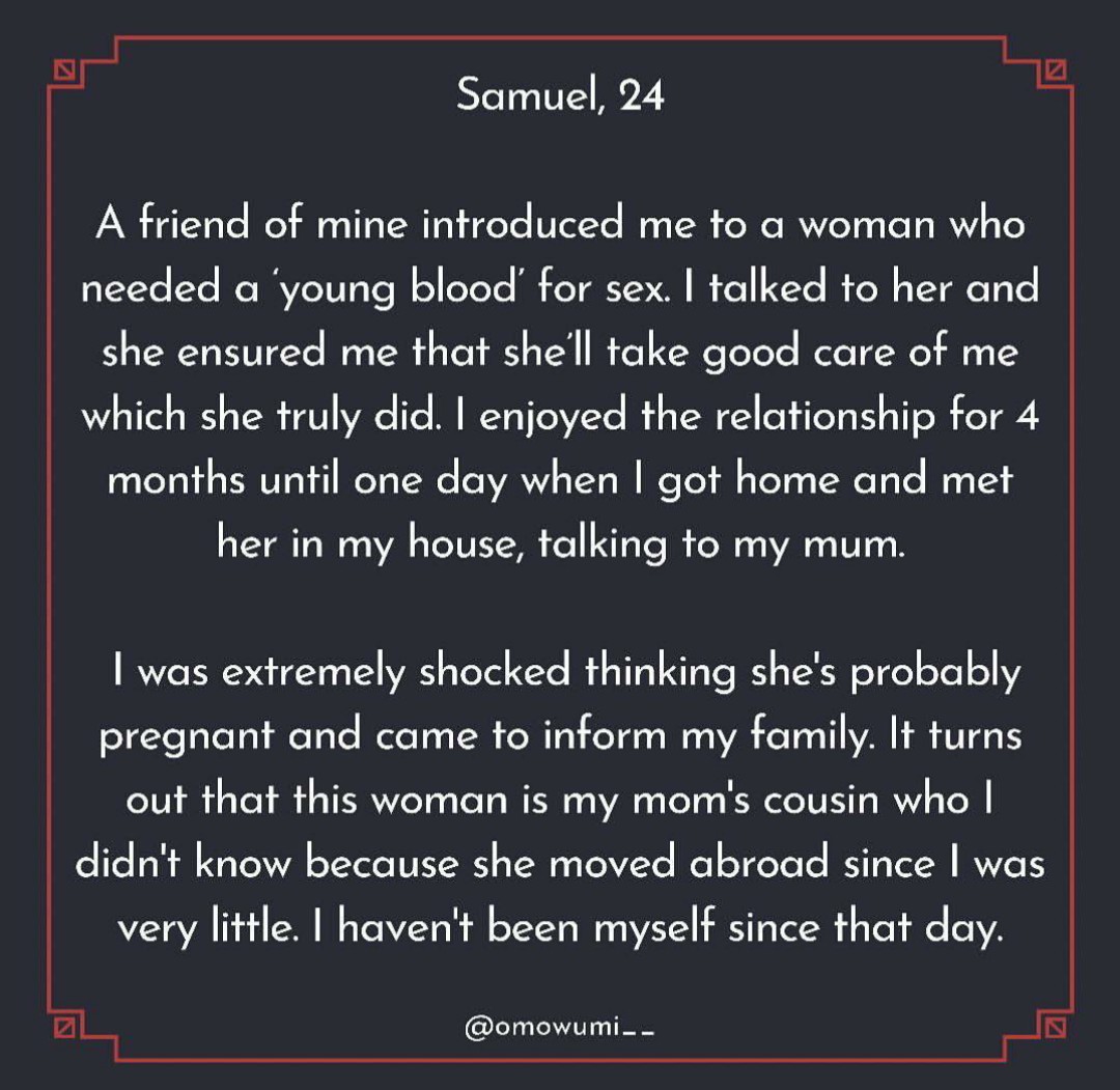 Umusore witwa Samuel yasangije abakoresha imbuga nkoranyambaga ukuntu yaryamanye n’umukecuru akaza gusanga bafitanye isano.